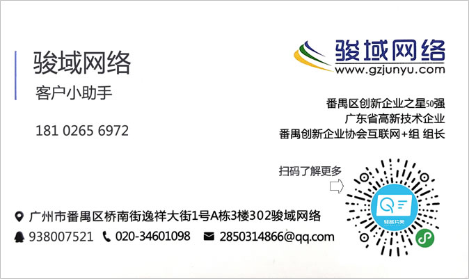 廣州駿域網絡科技有限公司成立于2005年,是一支由眾多具有多年實踐經驗的專業(yè)人士組成的高新技術團隊,專為企業(yè)提供網站建設、全網營銷、郵箱等服務,我們擁有嚴謹的程序開發(fā)人員、專業(yè)的美工設計、隨時為您效勞的售后服務人員,團隊人數達一百多人。目前我們已經榮幸的為廣州眾多知名企業(yè)提供了包括網站建設、手機網站、小程序、企業(yè)軟件開發(fā)等多種基于互聯網技術的服務。 通過長期積累,駿域網絡目前已經擁有50000多家客戶。